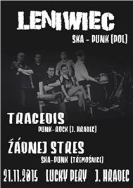 Ska-Punková událost podzimu se blíží. Pořádným dechovo-rockovým náserem vám přijedou vyhoukat vaše ušní bubínky hned dvě vynikající kapely. Z Třemošnice k vám na babetě přifrčí oblíbená parta kázající jednoduché poselství: ŽÁDNEJ STRES! Jako bonbónek večera, poprvé v Jindřichově Hradci z Polské Jelení Hory, festivaly otřelá a klubovkami ošlehaná skupina LENIWIEC. A pro všechny hradecký tragédy a tragédky, co se ještě udrží na nohou večer zakončí naše maličkost. Tady prostě nesmíš chybět!
