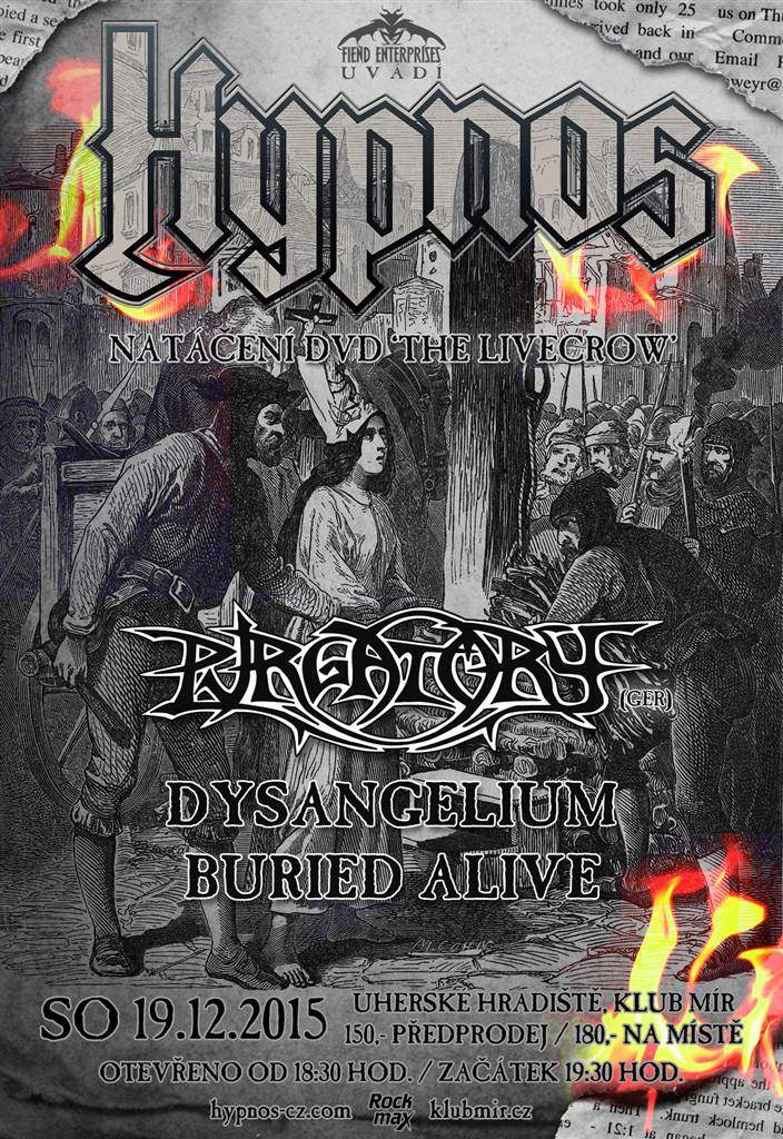Bruno zve na koncert : ,,Předvánoční koncert HYPNOS na domácím pódiu klubu Mír v Uherském Hradiští bude mít opět jedno zajímavé specifikum. Bude jím natáčení celého koncertu pro DVD nazvané „The Livecrow“, které bude součástí speciální edice nově připravovaného alba „The Whitecrow“. To by se mělo začít nahrávat krátce po Novém roce 2016 znovu s norským producentem Borge Finstadem ve studiu Shaark. „Chceme, aby se z uherskohradišťských koncertů HYPNOS stala tradice, kde se sejdou nejen fanoušci death metalu sledující aktuální dění na scéně, ale i takoví, kteří se v této komunitě pohybovali zejména v devadesátých letech. Ti zde mohou potkat staré přátele a party, jejichž životní cesty se díky rozdílným osudům na čas rozešly. Death metal je totiž nejen hudební, ale i sociální záležitost“, říká frontman Bruno a ihned dodává: „Mě osobně velmi těší, že každým rokem chodí na naše vánoční koncerty více a více lidí a nepochybuju o tom, že letos to bude nový rekord. Chtěli bychom, aby to byl do největší koncert HYPNOS, jaký jsme doma kdy odehráli. A budeme se snažit, aby byl pro všechny přítomné zážitkem, kde jinde bychom měli natočit své první oficiální DVD než na scéně, která nás „udělala“ a která vždycky tak silně stála při nás. Chceme vyjádřit, že si toho vážíme“