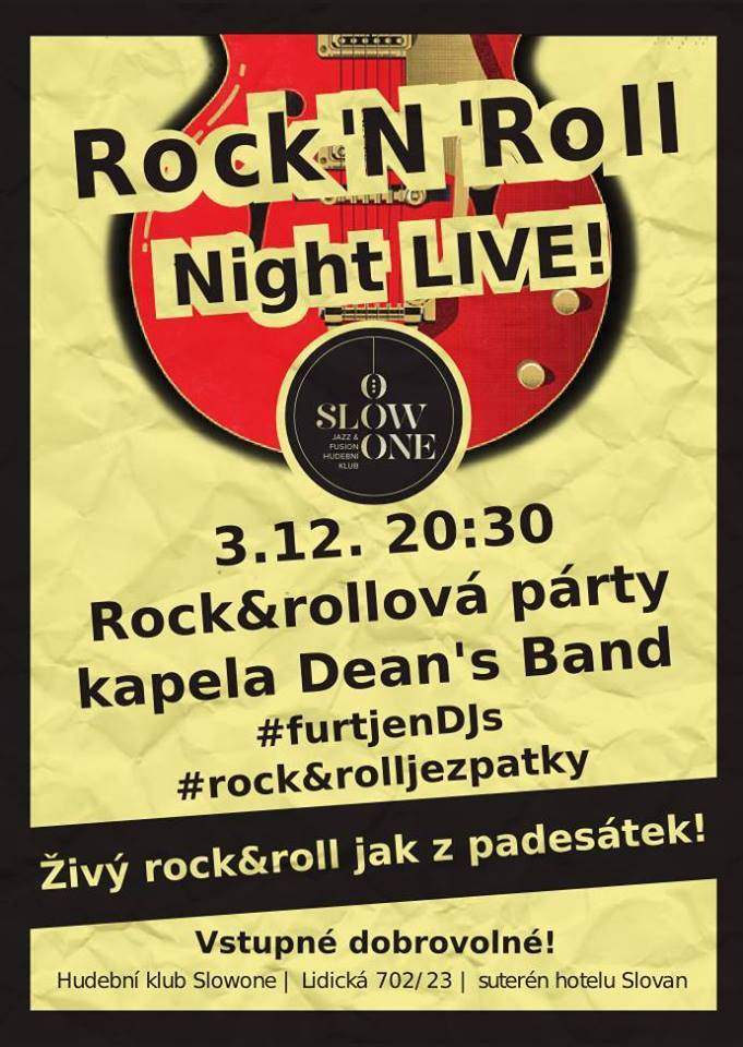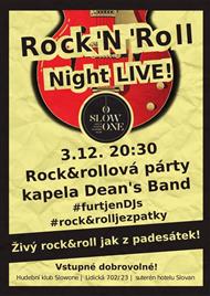 Přijďte si užít rock'n'roll 50. v podání kapely Dean's Band! Budete moct trsat, tančít, vyblbnout se na parketu, nebo sedět u drinku a poslouchat koncert.