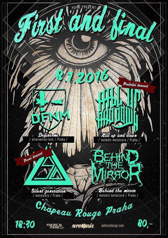 Místo na scéně však nezůstane prázdné, protože na akci odehrají svůj PRVNÍ KONCERT naši zkušebnoví fellaz Silent Generation! Dále se na akci představí jako hlavní účinkující pražští Define Me, kteří za necelý rok svého působení mají již na kontě dva videoklipy, a určitě o nich ještě hodně uslyšíme. Akci otevře další nadějná mladá kapela z Prahy – Behind the Mirror, ve které můžete vidět mimo jiné i našeho bubeníka Honzu a basáka Vojtu.