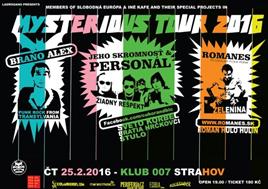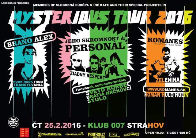 Dámy a pánové, slovenská punk rocková smotánka se nám chystá přiject do Prahy ukázat, zač je toho loket. Ale vážně, tento naprosto unikátní projekt, respektive kombinace tří projektů, se už nebude opakovat. Jako první vystoupí ROMANES, basák Iného Kafe, Roman "Hulo" Hulín a jeho prvotřídní petržalka folk punk. Další pán na holení nebude nikdo jiný než Svetozár Korbel, kytarista Slobodné Európy osobně a jeho kapela PERSONÁL. Poctivej garage punk rock...tečka. Po svém vlastním vystoupení všichni doprovodí při koncertě mistra Braňo Alexe (ex-Slobodná Európa), který zazpívá pár pecek ze svého sólového alba z roku 1999 "This is punk rock from Transylvania" a také pár vlastních skladeb z repertoáru Slobodné Európy. A tím bude přímo vražedná slovenská punková trojkombinace finálně završena. Na Tatrou sa blýská a na 007..budou 25.února hromy lítat.