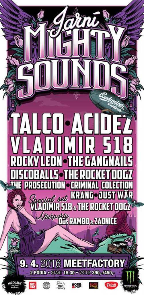Nemůžete se dočkat konce července? Připravili jsme pro vás party, která by vám mohla notně zkrátit čekání! V pražské Meetfactory proběhne 9. dubna jarní edice Mighty Sounds. Můžete se těšit na ska-punkové matadory Talco, mexický HC/punkový masakr Acidez, hudebního kouzelníka Rockyho Leona, unikátní projekt Vladimira 518 s The Rocket Dogz, německou ska-punkovou mašinu The Prosecution, českou ska-punkovou stálici Discoballs, psychobilly partu Gangnails, punkové sypačky Criminal Colection a Krang a stoupající HC/punkovou hvězdu Just Wär.