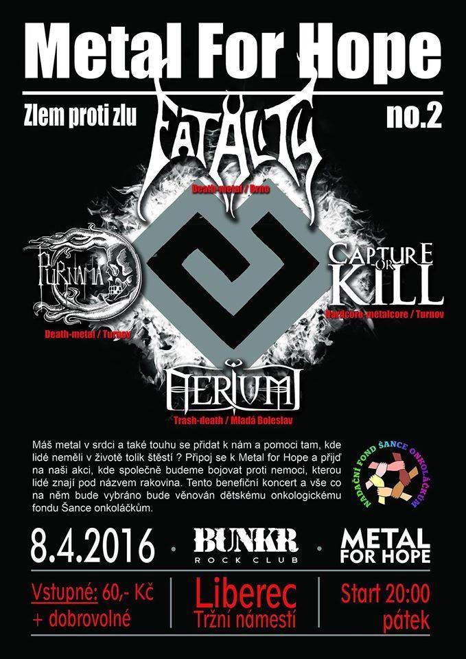 Máš metal v srdci a také touhu se přidat k nám a pomoci tam, kde lidé neměli v životě tolik štěstí ? Připoj se k Metal for Hope a přijď na naši akci, kde společně budeme bojovat proti nemoci, kterou lidé znají pod názvem rakovina. Tento benefiční koncert a vše co na něm bude vybráno bude věnován dětskému onkologickému fondu Šance onkoláčkům.