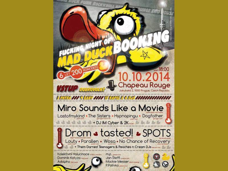 To vše a mnohem více oslaví Zefv (MAD DUCK BOOKING) a třeba i ty v pátek 10.10.2014 v podzemním labyrintu Chapeau Rouge Prague na Starém Městě. Tři patra a patnáct kapel & šest DJs budou připraveni pro všechny kamarády, kapely i náhodný kolemjdoucí. Každej bude tenhle večer VIP host a rozhodně to nebude končit u welcome drinku. A všude budou samý kachničky!
