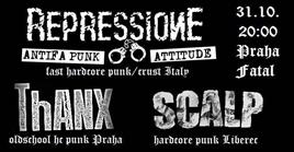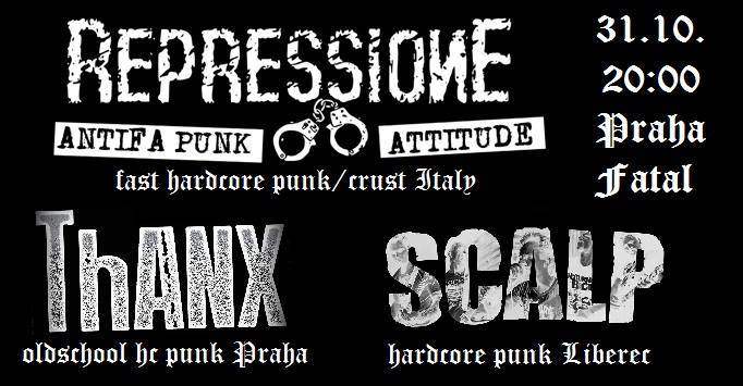 V Itálii vždycky uměli hrát dobrej, zběsilej a pořádně nasranej hardcore punk. A přesně tenhle druh uštěkanýho a politickýho punku nasáklýho grindem a crustem hrajou i Repressione z Boloni. A s nimi v úterý 31.10 zahrají v Praze ještě dvě český komanda - SCALP z Liberce a oldschool punx ThANX. To červený, co ti během poga poteče z nosu rozhodně nebude vomáčka.