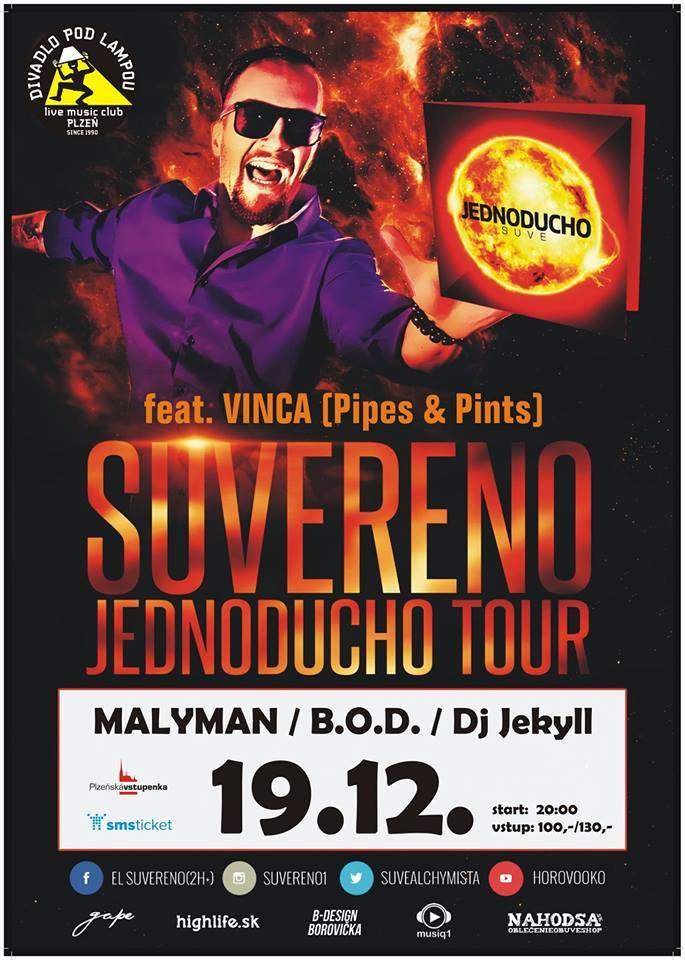Jeden z nejvýraznějších slovenských raperů Suvereno vystoupí v rámci svého československého turné k novému albu „Jednoducho“ v plzeňském Divadle pod lampou, kde ho na bicí navíc doprovodí Vinca z punk rockových Pipes & Pints!