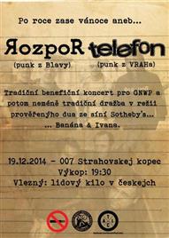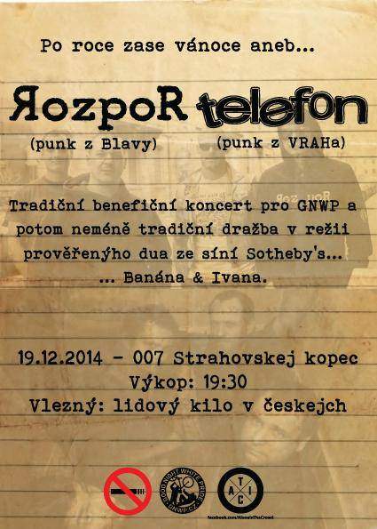 Na pátek 19.12. je přichástán další ze série dnes už tradičních předvánočních benefitů pro kampaň Good Night White Pride na strahovské Sedmičce. Tentokráte akci podpoří dvě legendární kapely složené z veteránů české a slovenské podzemní scény. Slovenští angažovaní oi punks Rozpor a rožnovští punks Telefon. Každá kapela se za roky fungování dopracovala ke svému zcela osobitému rukopisu, bez toho aby jakkoliv rezignovala na svou výbušnou podstatu a jejich koncerty jsou toho jasným důkazem.