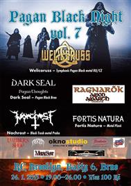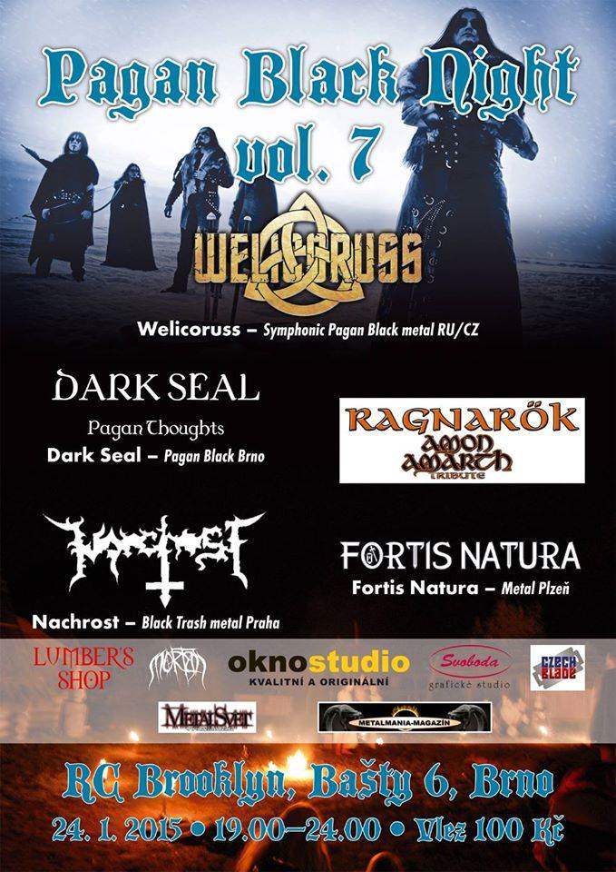 Pomalu se blíží rok 2015 a na jeho úvod jsme připravili další akci Pagan Black Night, v pořadí již s číslem 7. Tentokrát mimo naši domovskou kapelu DARK SEAL, se můžou fandové tvrdé muziky těšit na Česko/Ruskou formaci WELICORUSS, která hraje velice chytlavý symhonic pagan black metal. Dále sestavu doplní skvělá banda Ragnarök - Amon Amarth Tribute, kterou netřeba dlouze přestavovat, jejich koncerty, které zahráli na podzim 2014 byly strhující. Další pozvaná banda je Fortis Natura, která k nám se svým metalem a zajímavým ženským vokálem dorazí až z Plzně. Sestavu uzavírá Pražská black/trash banda Narchost z Prahy.