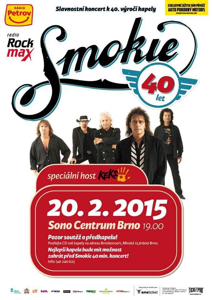 V pátek 20.2.2015 v moderním brněnském sále Sono Centrum Music Club fanouškům naservírují britské glamrockové legendy Smokie a pozor! V roce 2015 kapela oslaví 50 let od svého založení a 40 let na scéně! Vstupenky v ceně od 790 Kč jsou v prodeji exkluzivně v síti Ticketpro. Více informací na