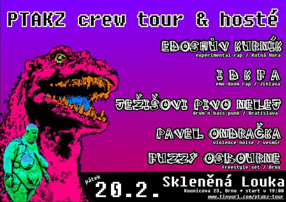 IDKFA - tento MC dorazí ze svého lesního studia na Vysočině s pořádnou dávkou horrorové introspekce a toxicky-existenciálních vtípků. IDKFA je v poslední době dost produktivní a za povšimnutí stojí taky jeho projekty SMRD, SEKS nebo Křik z ticha. Hudební podkres prochází většinou Edoshovou laboratoří a dokupy to pak může znít jako Dälek nebo třeba Super Crooo.