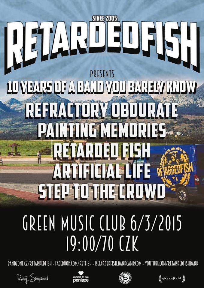 Retarded Fish oslavují deset let! K tomu všemu připravují nové EP, které Vám přijedou představit. Taková příležitost už se možná nebude opakovat, takže si to nesmíte nechat ujít. A aby toho lákání a vábení nebylo málo, tak všechny kapely se představí s nějakou novinkou! Polo-domácí STTC se připravují na nahrávání nového EP a můžete se těšit na to, že nějakou novinku napálí i ve Strážnici. Artificial Life představí svůj nový materiál, který už v těchto dnech můžete slyšet na jejich bandzone profilu. Poslední kapelou jsou Painting Memories z Brna, kteří minulý měsíc odcestovali do studia, aby tam vytvořili něco velkého a Vy to ve Strážnici uslyšíte! Poslední smečkou jsou Refractory Obdurate. Pohrobci lokálních kokotin spálili škatule a vrátili se do jeskyně. Bez previdel, bez breakdownů, bez přídavků. To musíte slyšet!