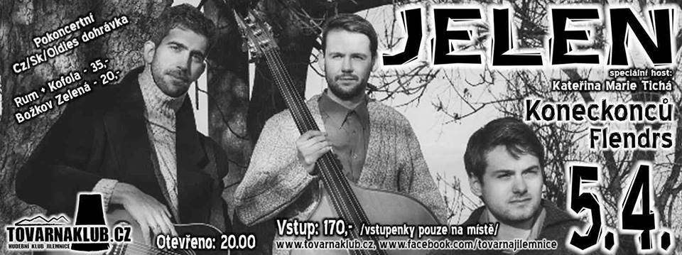 Ne, opravdu vás nezveme na žádný myslivecký ples ! Zveme vás na koncert kapely, která překvapila nejednoho člena továrenského kotle na prosincovém koncertu Divokýho Billa. Po obrovském úspěchu a neuvěřitelného množství pozitivních ohlasů právě na kapelu Jelen se kluci vrací „na místo činu“, do jarní Továrny i se speciálním hostem – zpěvačkou Kateřinou Marií Tichou! Nebudou tedy chybět hity „Magdalena“, „Jelen“, nebo aktuální „nambr van“ hit „Co Bylo Dál“.Už tak jedinečný hudební zážitek navíc podpoří v regionu oblíbené kapely Koneckonců a Flendrs. My vám k hudební pohodě natočíme na baru Rum s Kofolou za 35,- a Božkov Zelenou za 20,-. Nenechte si tedy ujít koncert party, která v roce 2014 odstartovala kariéru raketovým tempem a patří tak bezpochyby k hudebním objevům uplynulého roku ! Po koncertě následuje již tradiční Cz/Sk/Oldies mejdan až do rána !