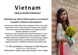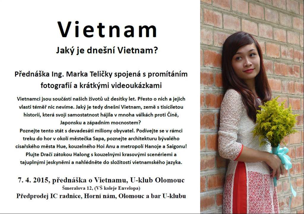 Jaký je současný Vietnam? Země s tisíciletou historií, která svoji samostatnost musela hájit v mnoha válkách s Čínou, Japonskem i proti západním mocnostmem. Poznejte devadesátimilionovou zemi. Trek do hor v okolí města Sapa, architektura císařského města Hue, kouzelný Hoi Anh, metropole Saigon a Hanoj. Dračí zátoka Halong s krasovými jeskyněmi. Poutavé vyprávění připravil ing. marek Telička, šéfredaktor časopisu Příroda spojené s promítáním fotografií a krátkými videoukázkami. Vstupné 90,-Kč v předprodeji, na místě 100,-Kč. Předprodeje vstupenek v IC, podloubí radnice, Horní náměstí Olomouc denně od 9:00 do 18:00 hod. v IC Hl.nádraží Olomouc- vestibul NON STOP, denně bar U-klubu od 18:00 hod. od 23.3.2015.