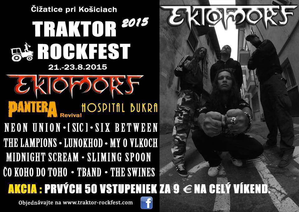 www.traktor-rockfest.com#!predpredaj/c4er , bude zaradených do žrebovania o CD EKTOMORFu s podpismi. Cena na mieste bude 12€ za celý víkend a 10€ na sobotu.