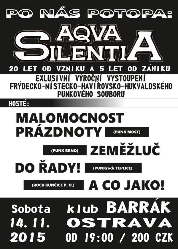 Kapela AQVA SILENTIA se rozhodla připomenout si dvacáté výročí první zkoušky (17. 11. 1995) a páté výročí posledního vystoupení (13. 11. 2010) uspořádáním mimořádné, jednorázové akce s několika zajímavými hosty. Zahrají a zazpívají: