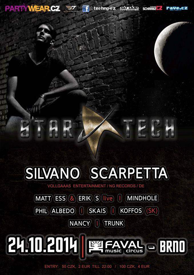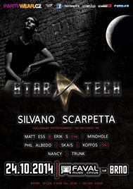 Tak jak se blíží podzim, tak se blíží i naše párty StarTech a to s pořadovým číslem "čtyři". Pro tento díl proběhlo pár změn a hlavní z nich je jedna stage o proti obvyklým dvěma. I tak se, ale nemusíte bát, že neuslyšíte hardtechno. Těšit se na tento styl můžete v podání Trunka, který je náš rezident nebo HardCore set od našeho bratra ze Slovenska - Koffose. Zbytek line upy tvoří různé odnože techna. Jako hlavního hosta přivítáme DJe a velkého producenta Silvana Scarpetta, který k nám zavítá z Německa se svým "darktechnem". Slyšet budete moci jedno live vystoupení, které tvoří Matt Ess a Erik S. Poprvé na StarTechu také zahraje něžné pohlaví a to DJka Nancy, která je také promotérka pardubické techno Bazinga. V neposlední řadě dlouholetý producent Mindhole. Pochopitělne nebude chybět ani promoterské duo akce Startech - Phil Albedo a Skais.