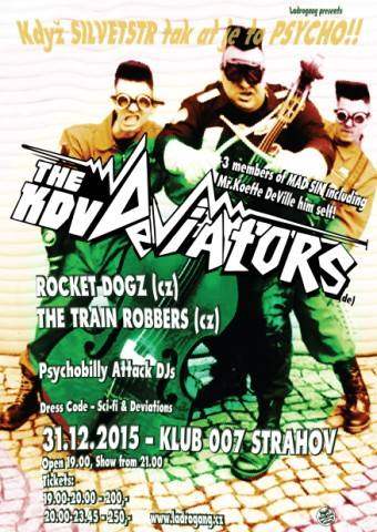 A psycho to teda bude! Podařilo se nám ulovit samotného pana Koefteho, krále (nejen) německého psychobilly a nenahraditelného frontmana Mad Sin. Jeho boční projekt, trojhlavá rock´n´rollová bestie, s názvem THE KDV DEVIATORS má na kontě své první album "Lost Contact" na Drunkabilly Records a krom mistra, který ke zpěvu hraje ještě na bicí, sestavu brilantně doplnil kytarista Ramon a kontrabasista Valle, ano, oba pánové taktéž ze slovutných Mad Sin. Rockabilly freakout from the sci-fi psycho garage- toť velmi trefná popiska jejich bohulibé produkce. Má to švih, má to šťávu, je to trochu ujetý a je to 1000% psycho-rokec. Dovolujeme si tvrdit, že tenhle večírek bude jeden z the best of 2015. U toho samozřejmě nesmí chybět dvě TOP pražský psychobilly bandy - all star team a lupu chtiví banditi - THE TRAIN ROBBERS a nenapravitelní darebáci a šviháci v jednom - THE ROCKET DOGZ. Víc nejlepší už to bejt nemůže! Vlastně ano, PSYCHOBILLY ATTACK DJs jako monstrózní afterparty! A máte to!